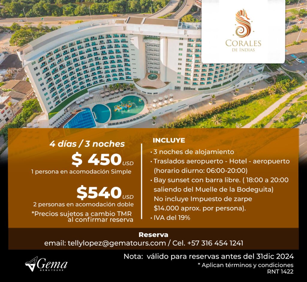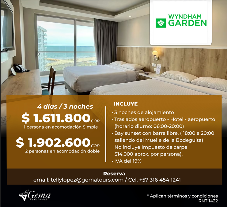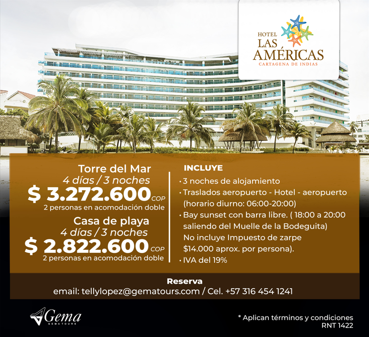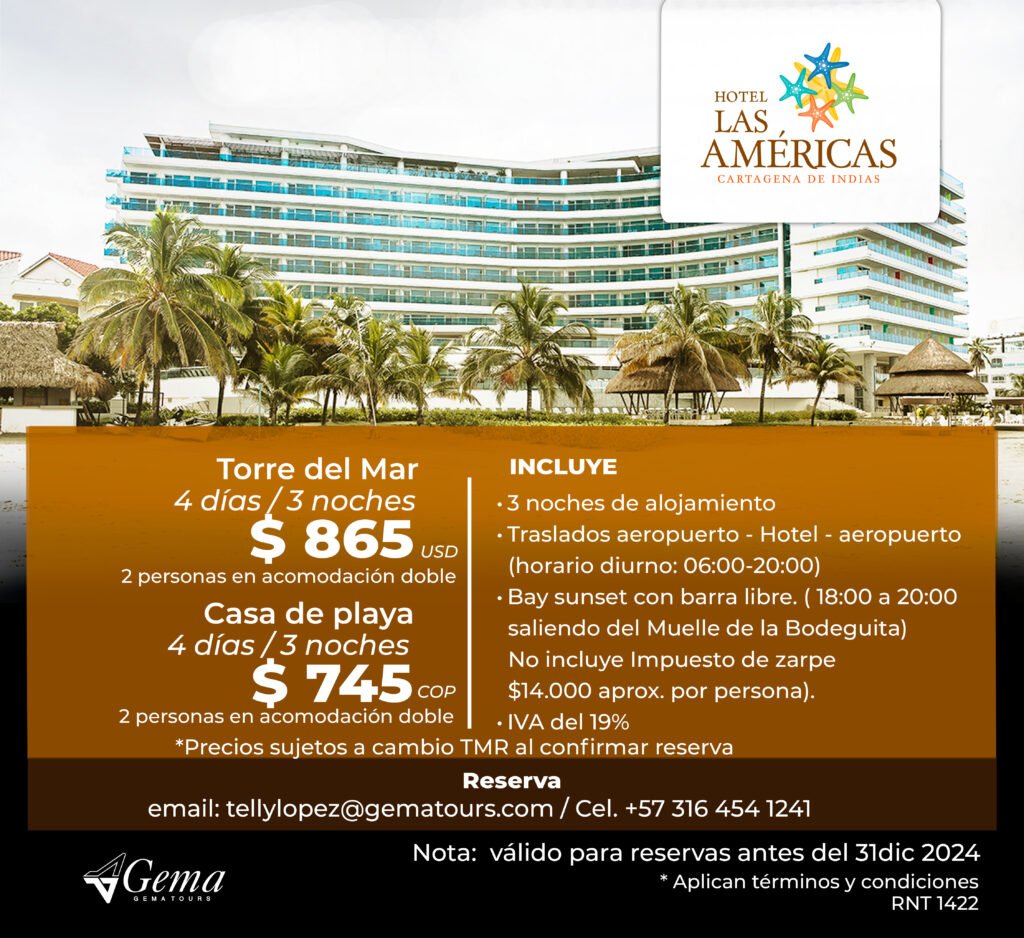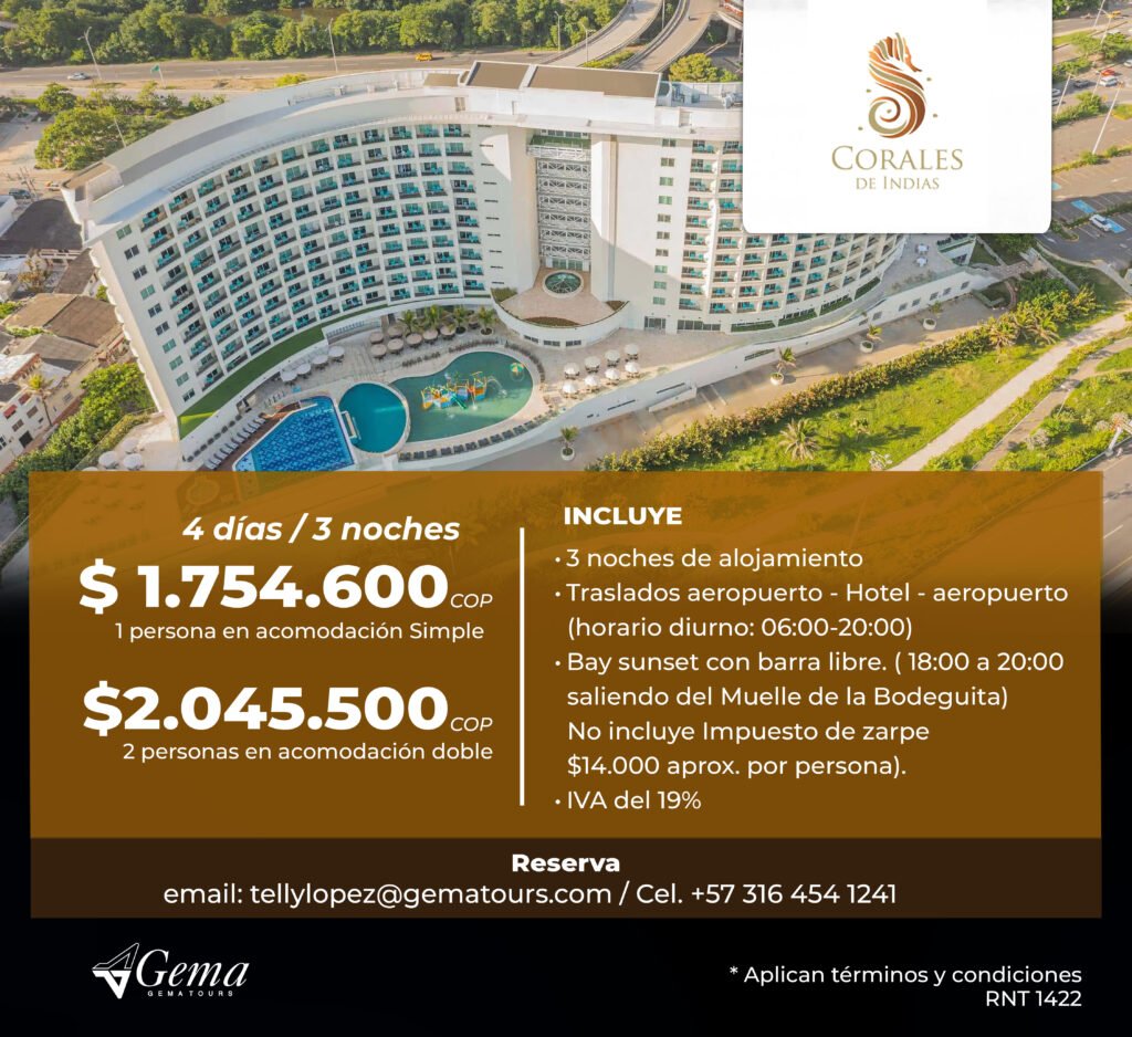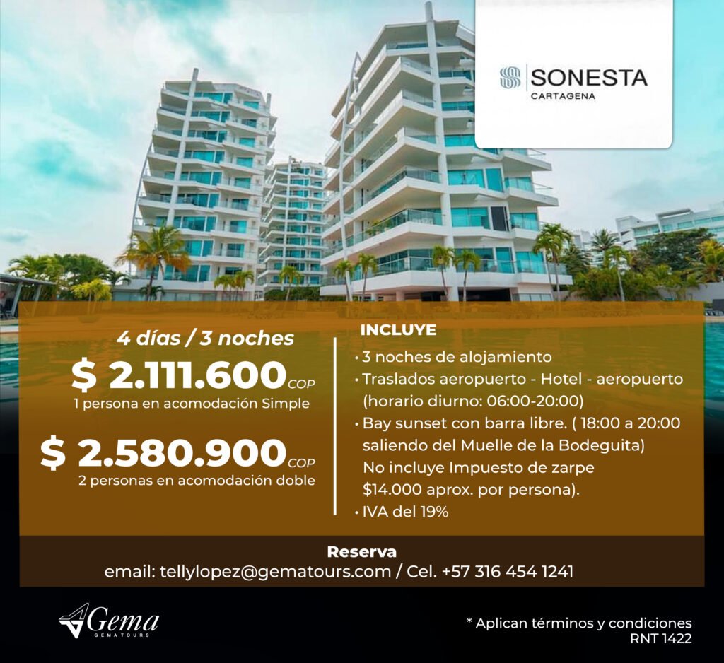 Otros Hoteles ¡Encuentra la opción perfecta para tu presupuesto!Llámame hoy y asegura tu estadía para el evento. ContáctoTelly LopezCelular: (+57) 316 454 1241tellylopez@gematours.com Tarifas en Pesos COP Tarifas en Dolares USD